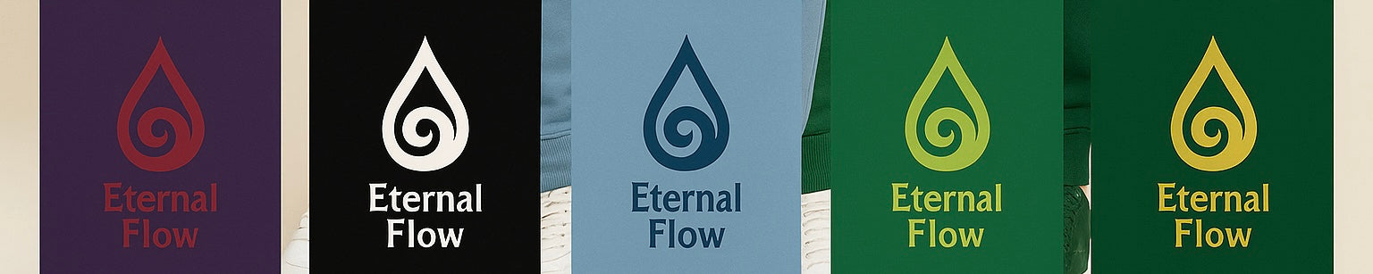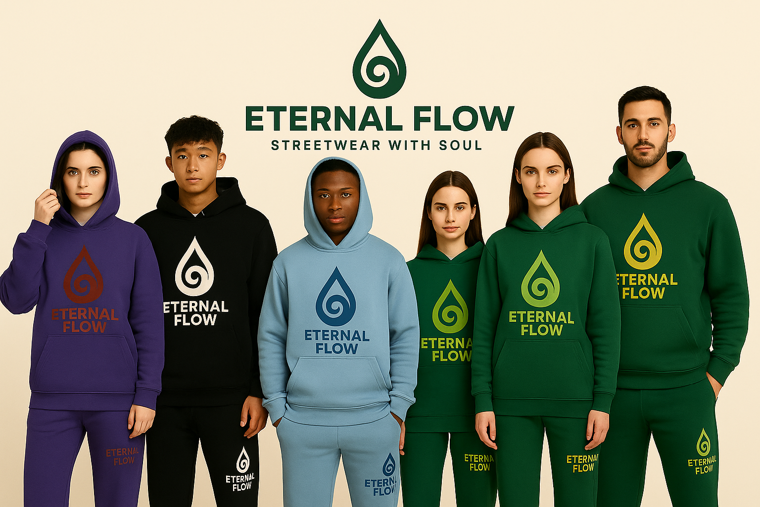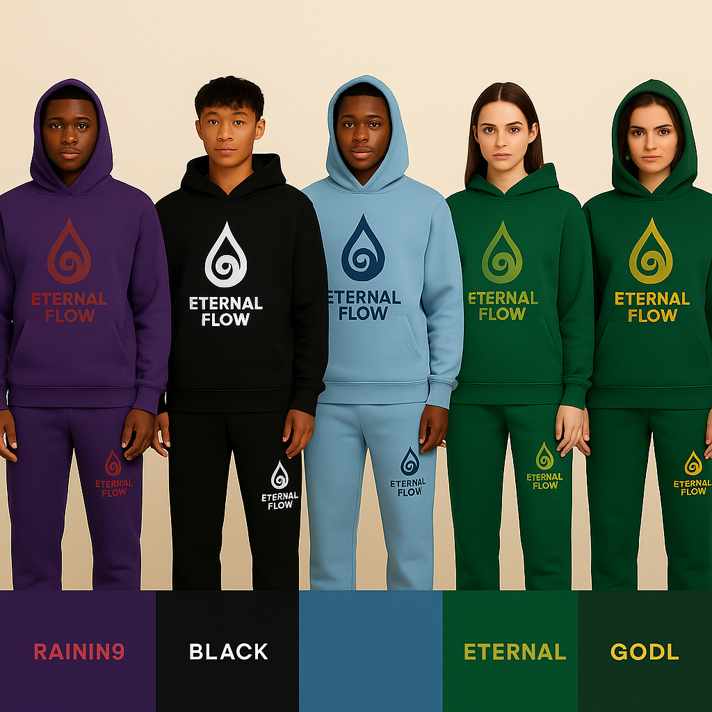 - ETERNAL FLOW drop name placed on the hoodie pockets & pants, grounding the design in movement and meaning.